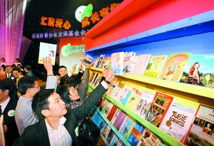 昨天,在深圳市青少年發展基金會舉行20周年頒獎典禮上,現場觀眾向甘肅省隴南市武都區城郊鄉姚寨學校踴躍捐書。 本報記者 許業周攝