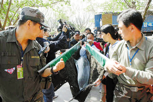 據深圳野生動物園隨行的工作人員介紹,18日17時,在深圳野生動物園和南寧動物園的工作人員協作下,3頭海豚被引上岸,并一一裝上“海豚專車”。工作人員費盡周折才將海豚引到岸邊,用幾條毛巾裹住海豚,慢慢地將它抬到海綿擔架上。為保護海豚的皮膚,海豚訓練員還用凡士林(一種潤滑劑)涂抹到海豚身上,最后再將海豚抬到一個裝滿海水的特制木箱里。因海豚是用肺呼吸的,所以必須使它浮在水面上,水的浮力恰好能將躺在海綿擔架上的海豚托出水面。工作人員還在海豚的兩側增加一些海綿墊,以免它在蠕動時傷及皮膚。剛剛被裝進“木箱”,3只海豚還有些不習慣,不停地擺動。海豚訓練員用撫摸的方式來穩定海豚的情緒,據海豚訓練員介紹,海豚很喜歡人撫摸或輕輕拍打它的皮膚,因為那樣它會感覺很舒服,就像人類的嬰兒一樣。經過海豚訓練員10分鐘左右的悉心“安撫”后,海豚漸漸消除了恐懼,安靜下來。