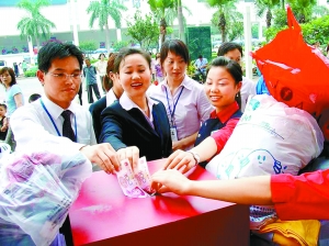 “愛延續(xù)”大型義賣現(xiàn)場之一——小朋友在媽媽帶領(lǐng)下積極捐款。