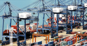 工作人員指揮裝滿活動板房的貨柜裝船。
