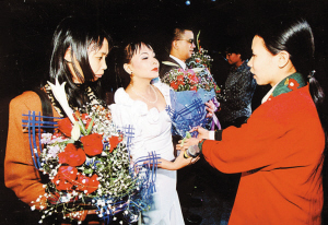 在2000年的一個(gè)表彰儀式上,成功移植眼角膜的患者給角膜捐獻(xiàn)者的家人獻(xiàn)上鮮花表達(dá)感謝。當(dāng)年深圳眼庫(kù)共接受了10例眼角膜捐獻(xiàn)。 深圳特區(qū)報(bào)記者許光明 攝